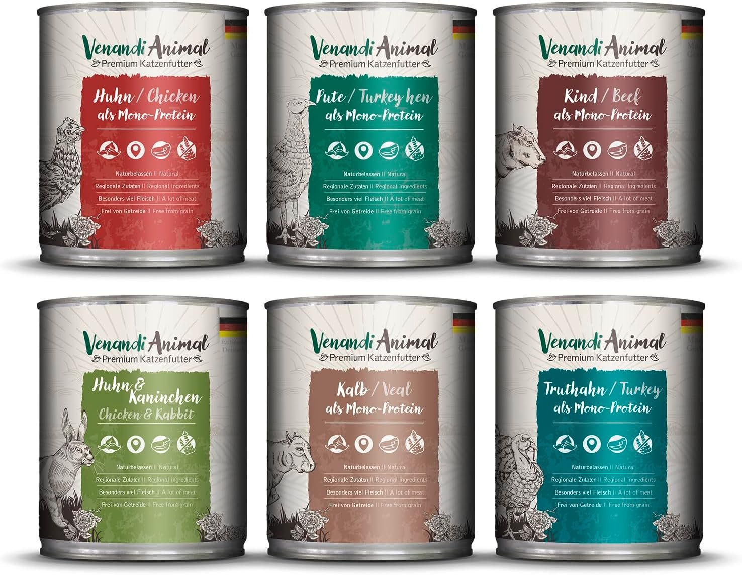 Venandi Animal Premium cibo umido per gatti, confezione di prova III, pollo, tacchino, manzo, pollo + coniglio, vitello, tacchino, 6 x 800 g, senza cereali e naturale, 4.8 kg