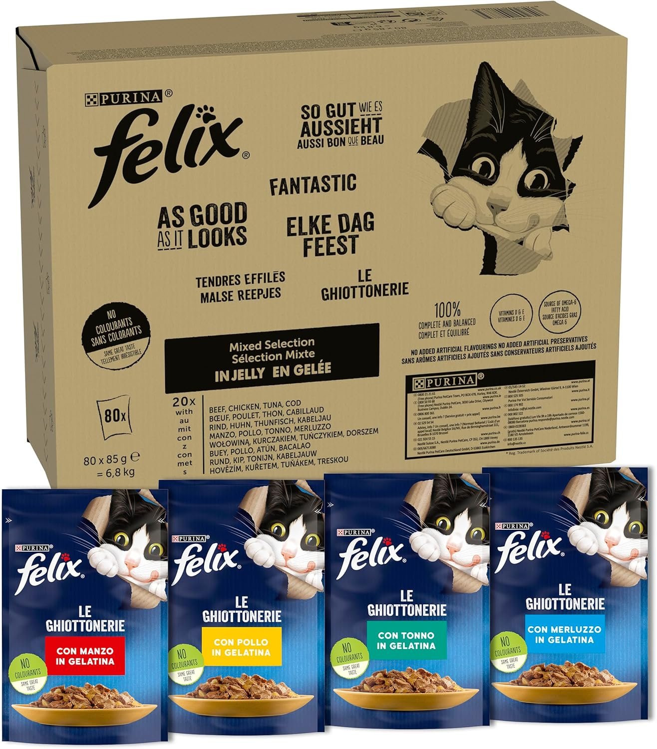 Purina Felix Le Ghiottonerie Cibo Umido per Gatti con Manzo, Pollo, Merluzzo e Tonno, 80 Buste da 85g