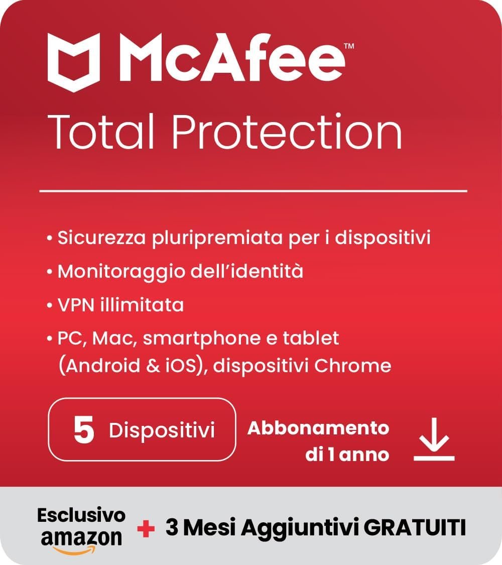 McAfee Total Protection 2024 Esclusiva Amazon, 5 dispositivi Antivirus, VPN, gestore password, Internet Security PC/Mac/iOS/Android Abbonamento di 15 mesi Codice di attivazione via e-mail