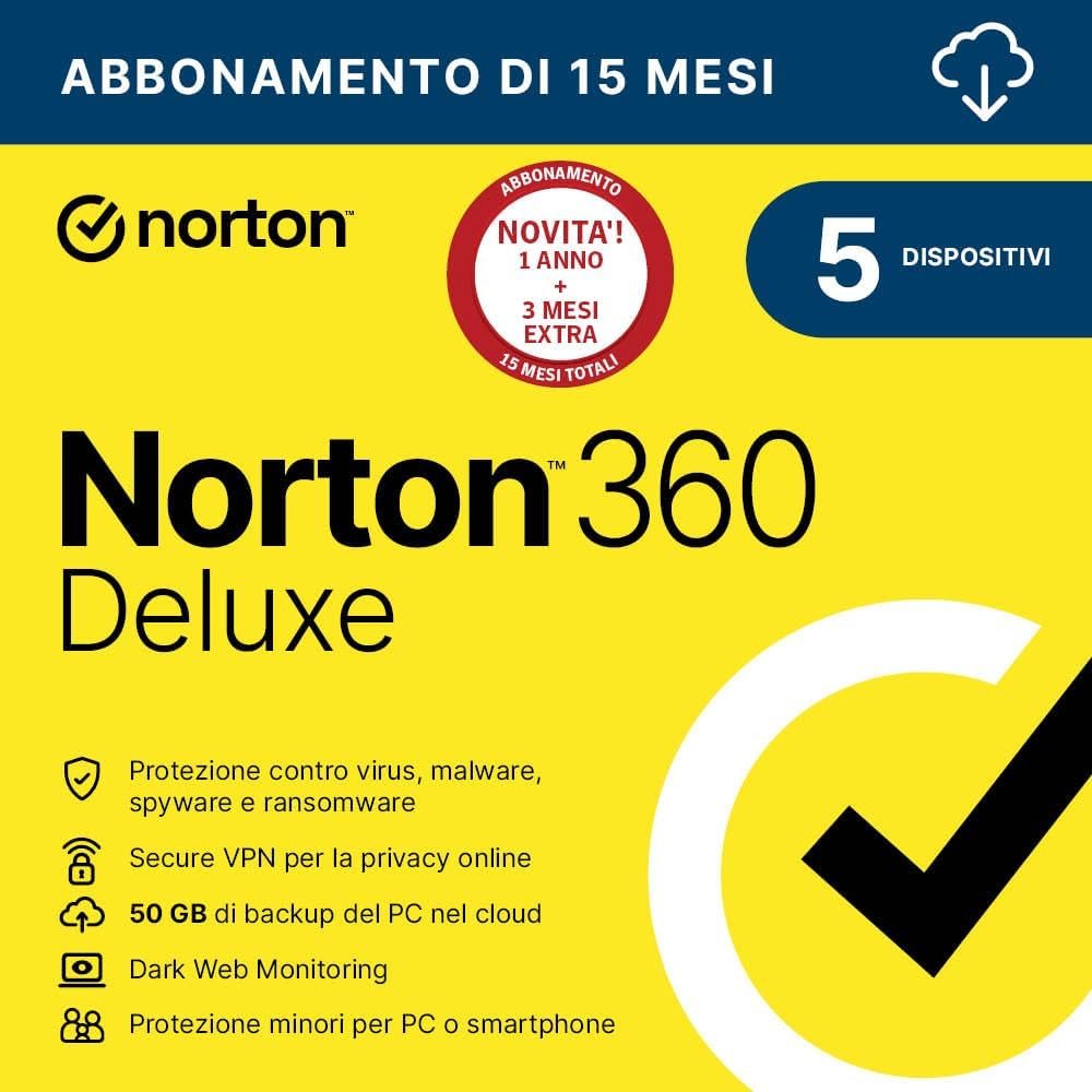 Norton 360 Deluxe 2024| Antivirus 5 dispositivi|15 mesi| Digital Download